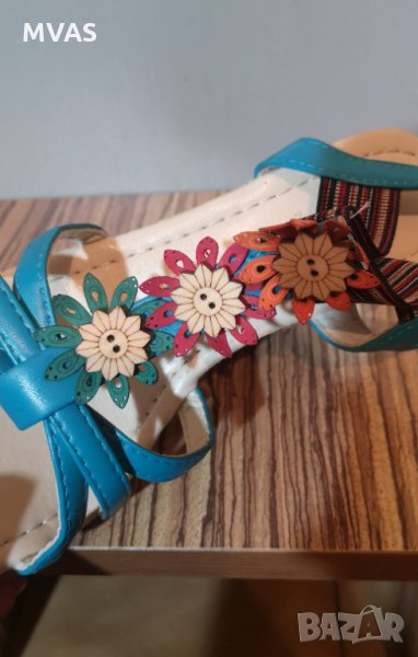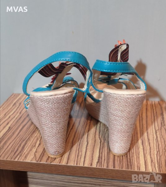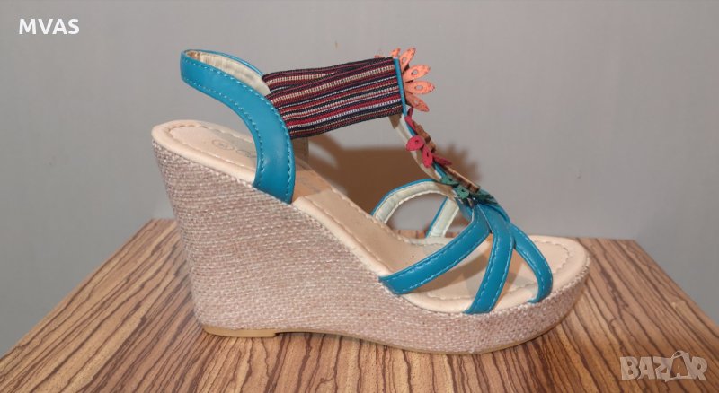 Нови сандали на платформа. Не са носени. Светло сини с декорация на цветя, платформата е с ленен кант. Много свежи за лятото. Удобна извивка. С ластик отпред придържащ крака, без ръбещи закопчалки.
