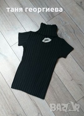 Нова уникална и много нежна плетена черна блузка с поло яка и страхотна декорация във формата на устни със сребристи камъчéта.