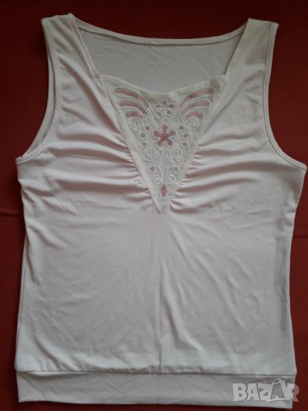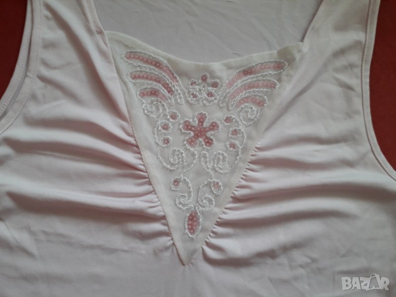 Дамска блуза без ръкав, триъгълно деколте с бродерия и мъниста, светлорозов цвят, еластична, размер М. Отговарям на съобщения тук, изпращам с куриер с отстъпка, преглед и тест, или лично предаване в София.