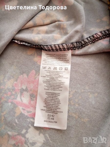 Роклята е 95 % полиестер и 5 % еластан, размер ЕU 42/ES 44, ГО 60 см./ръкава е леко тип прилеп/, дължина 90 см.