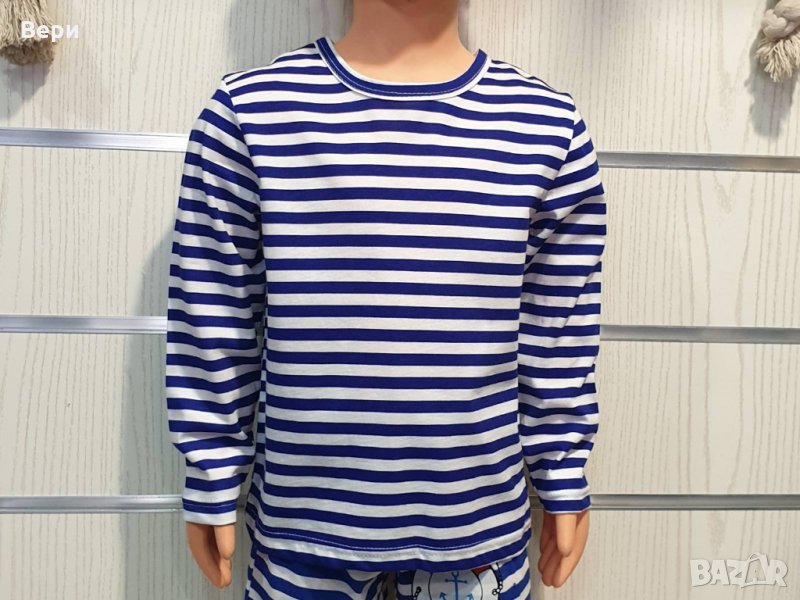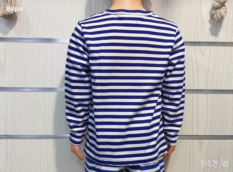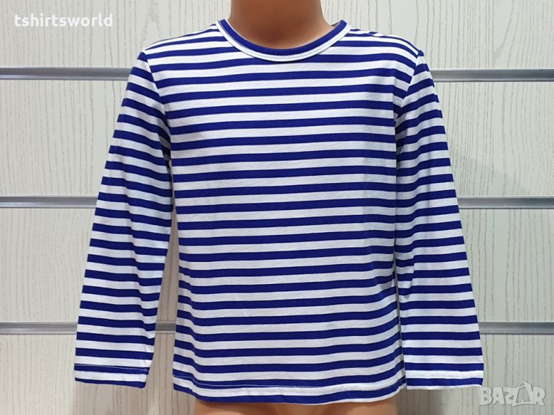 Страхотна нова детска класическа моряшка блузка с дълъг ръкав на синьо и бяло райе, произведена в България под марката PRINTEX, изработена от висококачествен 100% пениран памук с обло деколте. Подходяща за носене както навън, така и вкъщи пред телевизора. Материята не позволява да се измачка, което я прави изключително ценена и желана от нашите дългогодишни клиенти. Блузата може да се пере при температура до 40 градуса. Спокойно можем да гарантираме за качеството на изработката и ярките цветове на дизайна.