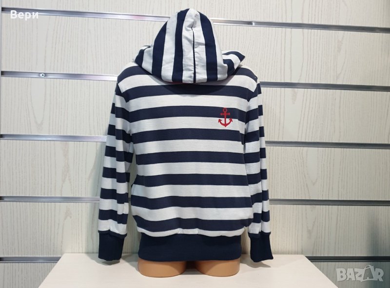 Страхотен нов детски моряшки суичър на тъмносиньо и бяло райе с качулка и малък трансферен печат Котвичка, произведен в България под марката PRINTEX, изработен от висококачествен 100% пениран памук. Материята на този суичър е изключително мека и финна при допир, не позволява да се измачка, което го прави изключително ценен и желан от нашите дългогодишни клиенти. Моделът е подходящ за пролетния и есенно-зимният сезон, има ластични маншети на китките, запазващи топлината. Свободната кройка го прави спортно-елегантен. Спокойно можем да гарантираме за качеството на изработката и ярките цветове на дизайна.