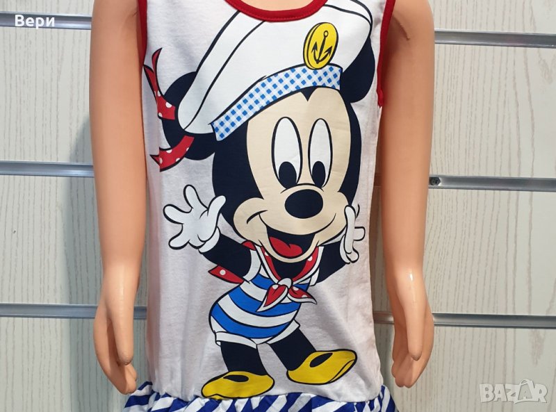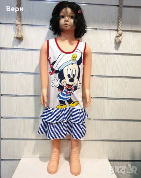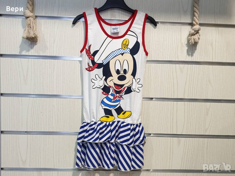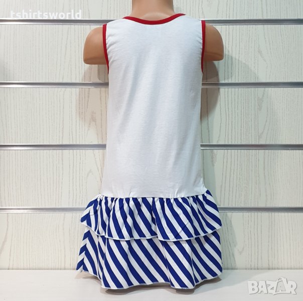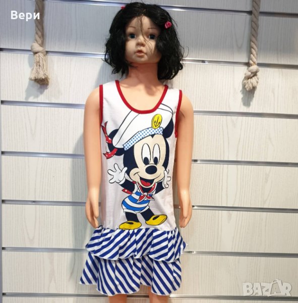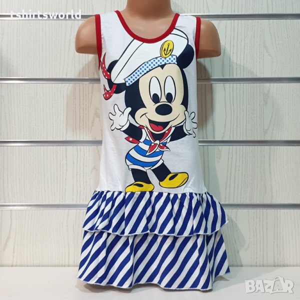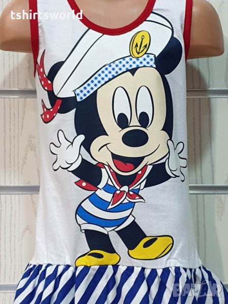 Страхотна нова детска моряшка рокличка на класическо синьо и бяло райе и трансферен печат Мики Маус, произведена в България под марката PRINTEX. За изработката на този, прекрасен модел е използван висококачествен 100% памук. Подходяща както за официални събития, така и за ежедневно носене на вашето дете, като допринася за комфорт в горещите летни дни. Съчетанието между бяло-синьо райе и синьо трико придава спортно-елегантен стил на роклята. Високото качество на изработка не позволява разтегливост, завалване или губене на форма при пране.