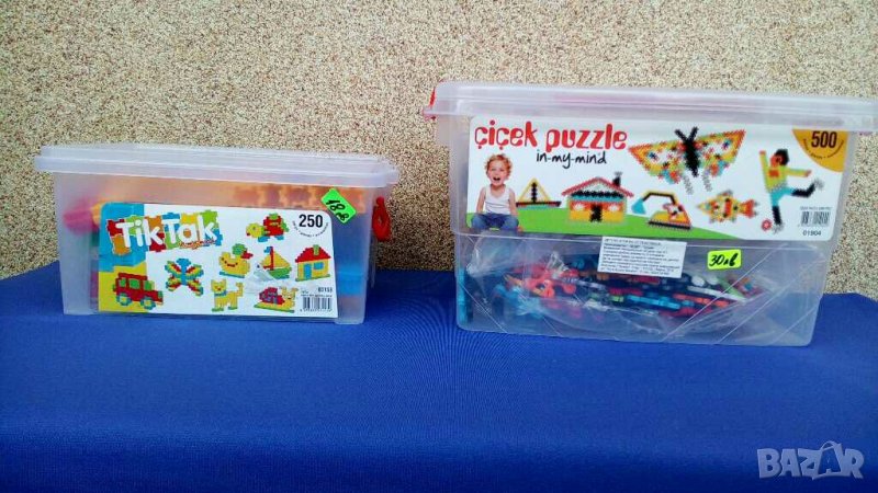 Конструктори от пластмасови фигури за конструиране на различни предмети с части от 250 части с цена 15лв, и от 500 части за 25лв.