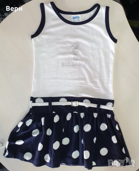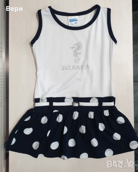 Страхотна нова детска моряшка рокличка на точки с пола тип плисе, обло деколте и коланче, произведена в България под марката PRINTEX. За изработката на този, прекрасен модел е използвана 90% вискоза и 10% еластан. Подходяща както за официални събития, така и за ежедневието на вашето дете, като допринася за комфорт в горещите летни дни. Съчетанието между бяло-синьо райе и синьо трико придава спортно-елегантен стил на роклята. Високото качество на изработка не позволява разтегливост, завалване или губене на форма при пране.