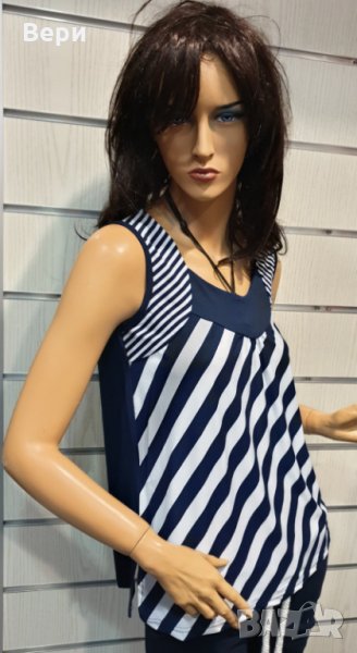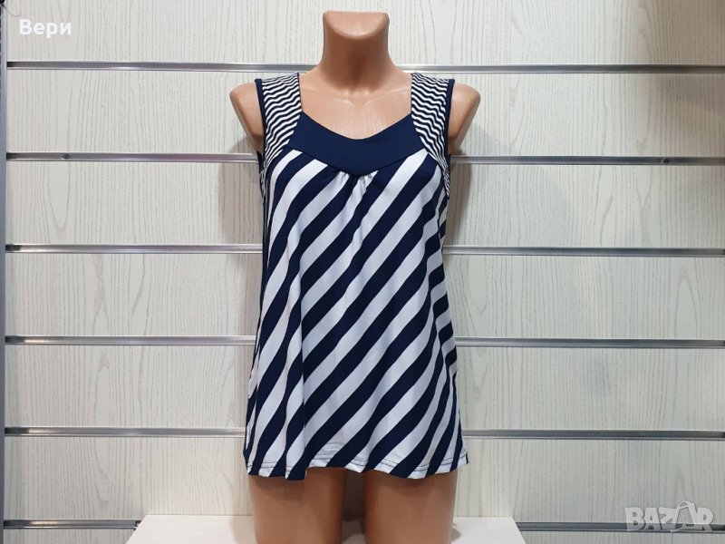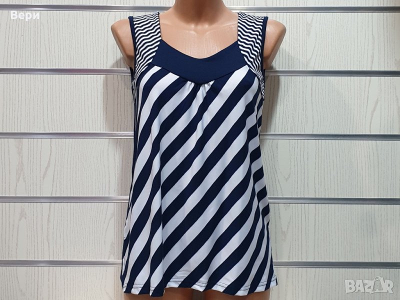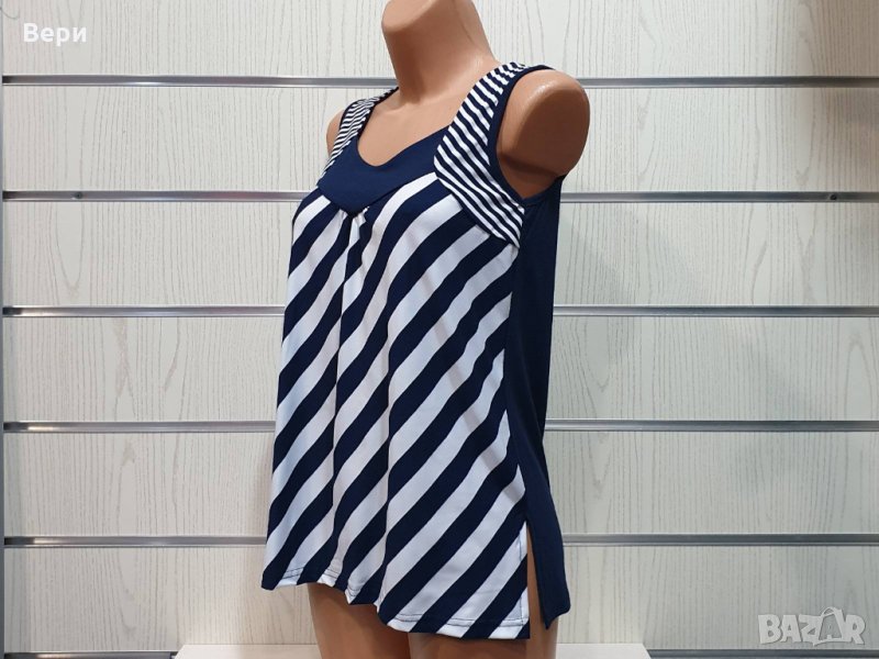 Нова елегантна моряшка дамска блуза без ръкави с овално деколте на широки тъмносини райета. Произведена в България под марката PRINTEX , изработена от 90% вискоза и 10% еластан. Подходяща за носене както в горещите летни дни навън, така и вкъщи пред телевизора. Материята на тази блуза е изключително мека и финна при допир, не позволява да се измачка, което я прави изключително ценена и желана от нашите дългогодишни клиенти. Нашите блузи се перат на не повече от 40 градуса в пералня и при пране не подлежат на свиване. Моряшката линия на марката PRINTEX радва своите клиенти повече от 7 години.