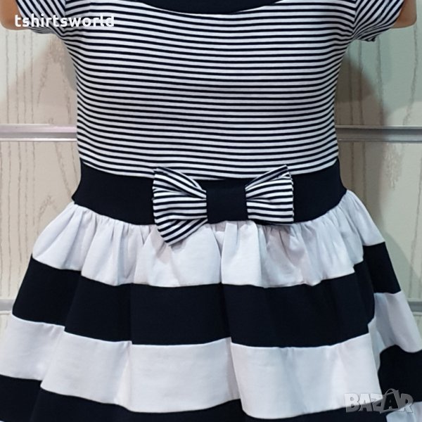 Страхотна нова детска моряшка рокличка на тъмносиньо и бяло райе с панделка, висока талия и пола тип плисе, произведена в България под марката PRINTEX. За изработката на този, прекрасен модел е използван висококачествен 100% памук. Подходяща както за официални събития, така и за ежедневно носене на вашето дете, като допринася за комфорт в горещите летни дни. Съчетанието между бяло-синьо райе и синьо трико придава спортно-елегантен стил на роклята. Високото качество на изработка не позволява разтегливост, завалване или губене на форма при пране.