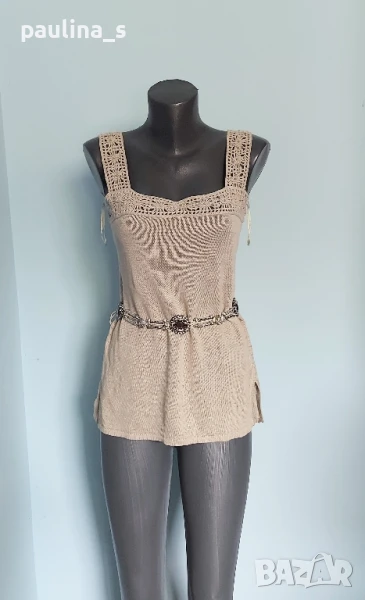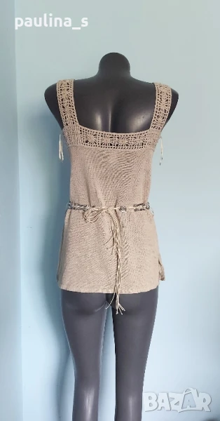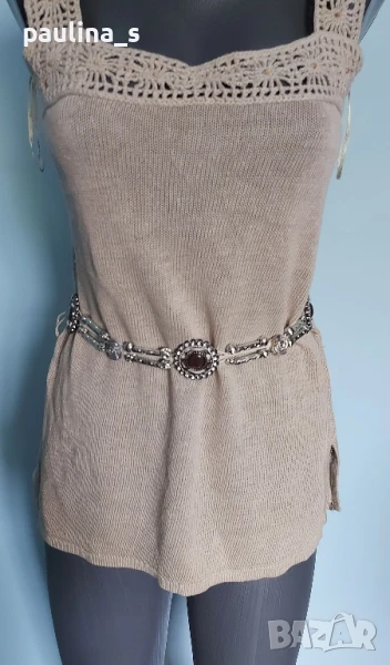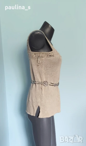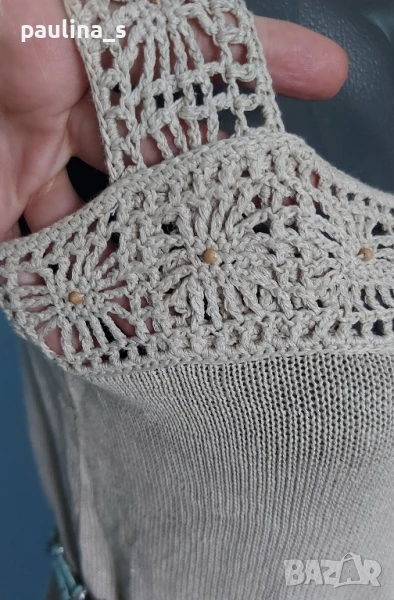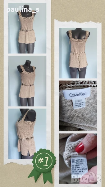2️⃣. Колаж / M / XL - "Calvin Klein". Цената е крайна 39,99лв. Колаж / M / XL - "Calvin Klein". Цената е крайна 39,99лв / 19,8 евро. Дизайнерска ленена туника с плетиво. Декорациите около деколтето и презрамките са ръчно изплетена дантела с дървени мъниста. Трикото е едро изплетено с известна еластичност, размер по етикет М. Ленът е скъпа материя, бранда си е популярен, луксозен и перфектен. Коланът не се продава отделно - цена 9, 99лв / 5 евро. Предпочитам артикулите да не се делят! Общата цена е сумарна!