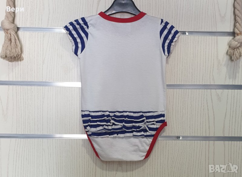 Представяме ви нашето страхотно ново моряшко боди за момиченце в бяло с къси ръкавки на класическо синьо и бяло райе с трансферен печат на Мини Маус. Произведено в България под марката PRINTEX от 100% висококачествен памук. За по-голямо удобство за обличане има капси в горната част и в долната част за лесна смяна на памперса.
