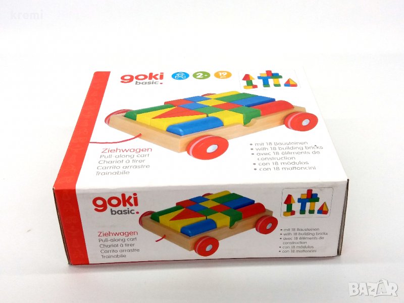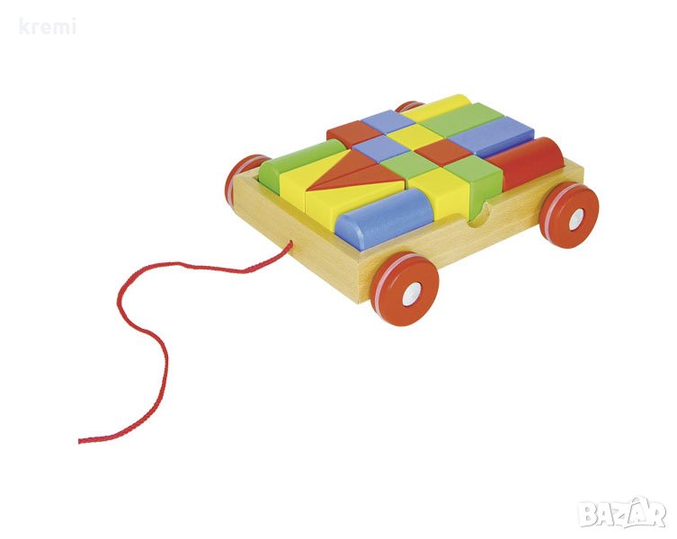 Дървен конструктор, който може да бъде свободно подреден или да бъде върху дървена количка, която може да се дърпа.