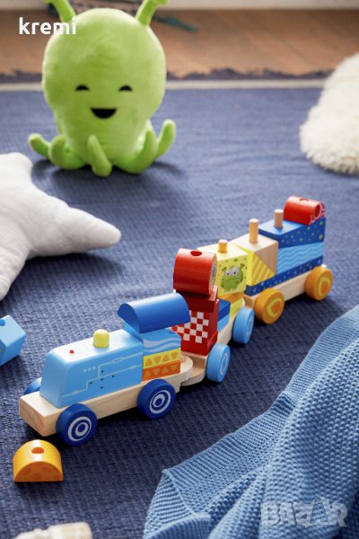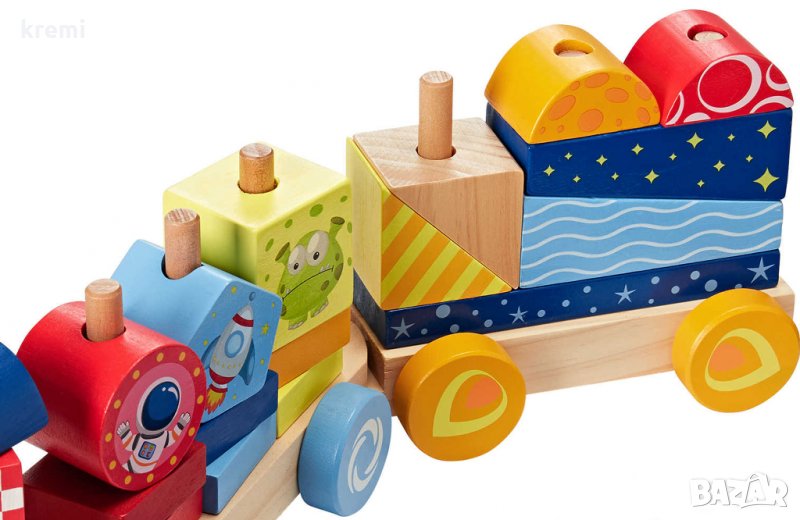 Освен да се бута и движи, може да сглобявате и разглобявате механично вагоните, да нареждате 22 цветни строителни геометрични блокчета.