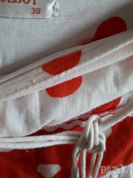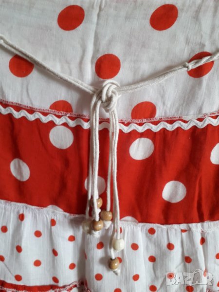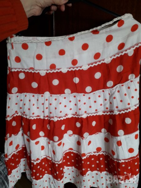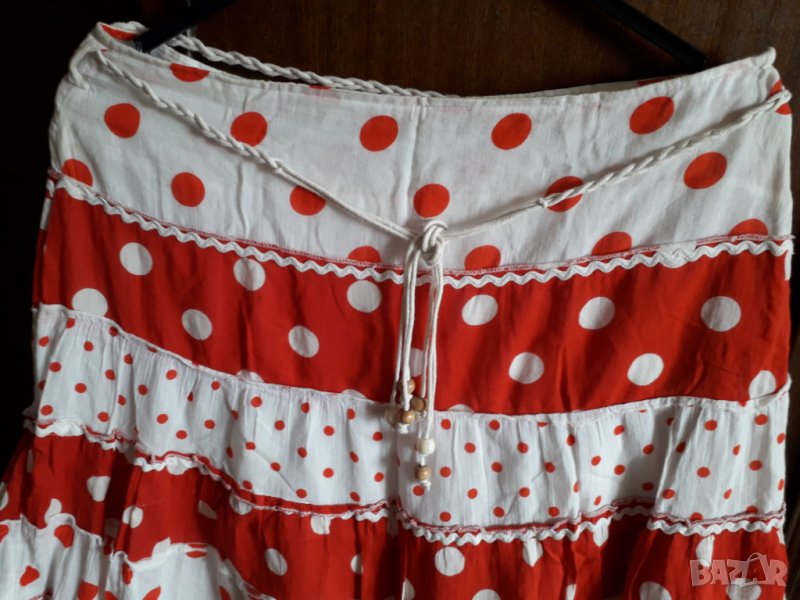 Дамска лятна разкроена пола на точки, памучна лека материя на волани с бяло ширитче, разширяваща се надолу, има бяло плетено коланче с дървени мъниста, полата е с подплата отдолу. Цвят бяло и червено на по-големи и по-малки точки. Размер М или 38-40 - талия 40 см, надолу се разширява - ханш 54 см и дължина 64 см.