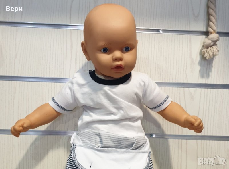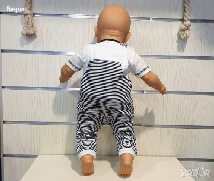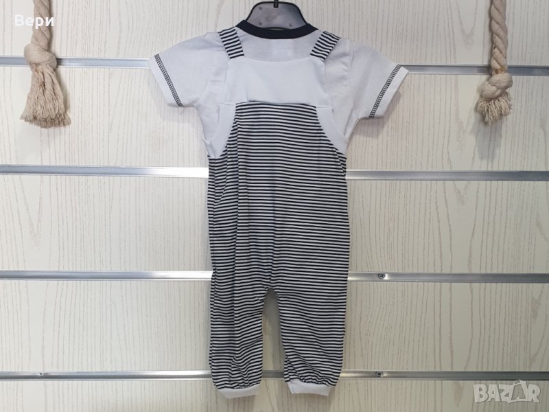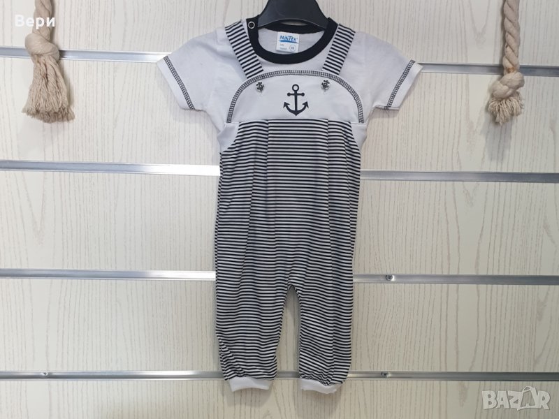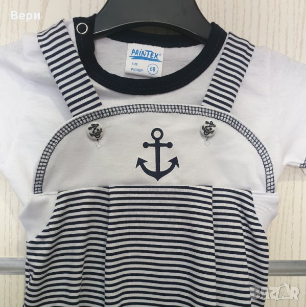 Представяме ви нашето страхотно ново моряшко боди/гащеризон от две части: бяла тениска и гащеризон, подходящо за момиченца и момченца на тънко райе с малък трансферен печат Котвичка. Произведено в България под марката PRINTEX от 100% висококачествен памук. За по-голямо удобство за обличане има капси в горната част и в долната част за лесна смяна на памперса.