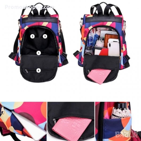 Изключително удобни и практични - цветни и шарени дамски раници / чанти,изклющително леки, идеални за всеки сезон. С възможност за носене едновременно и като дамска чанта и като раница. Раниците разполагат с 1 голям джоб, 2 джоба с цип и още 2 броя други странични джобове - показани са на снимките. Имат и 3 бр. малки вътрешни джобове. Големият джоб се отваря от към гърба на раницата, което ги прави изключително сигурни при пътуване в обществен транспорт, срещу кражби.