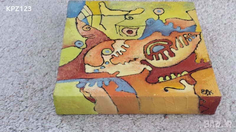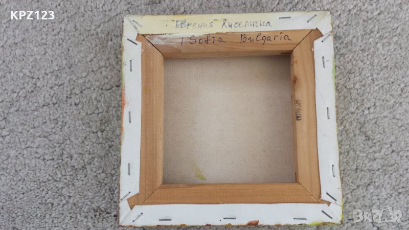 Картина "Лагуна", автор Евгения Киселичка, подпис (долу дясно). Нарисувана е с маслени бои върху платно с подрамка. Размери 20 см х 20 сантиметра. Дебелина на подрамката 3.70 сантиметра