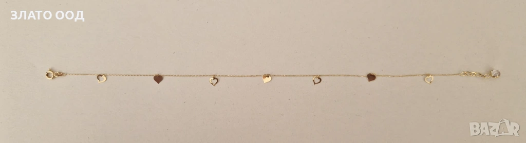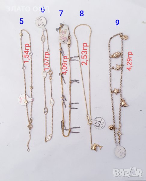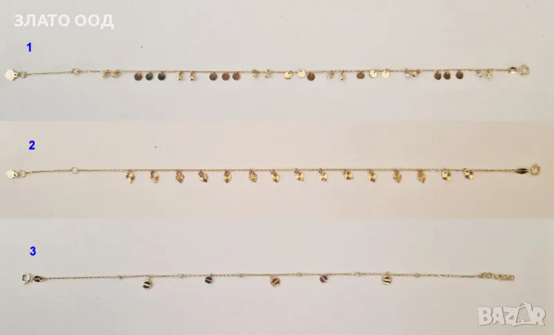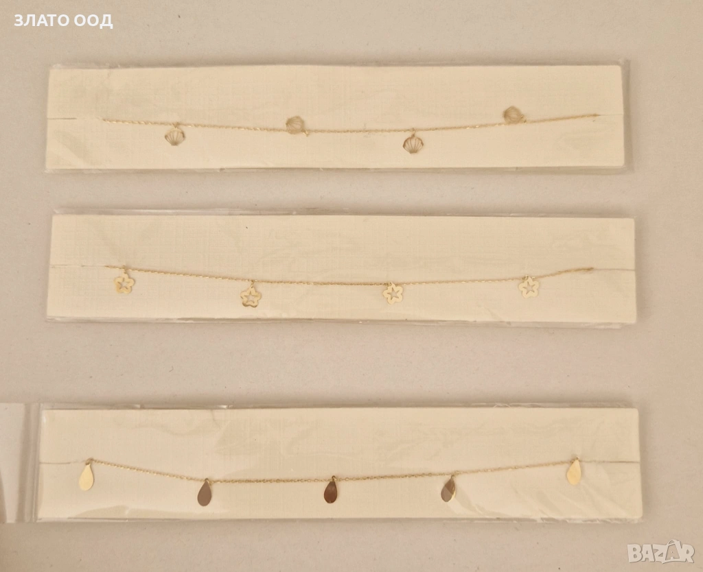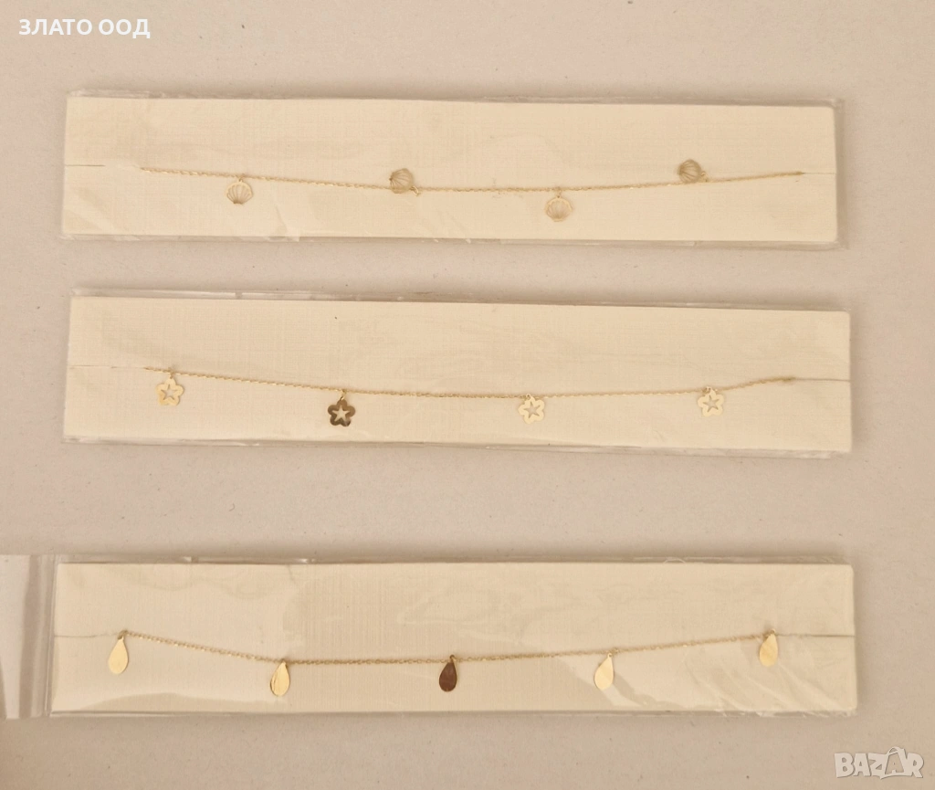 Златни гривни за крак. Сертификат и маркер проба 585. Повечето се закопчават на няколко степени . Цени от 140 € за 1 брой и нагоре.