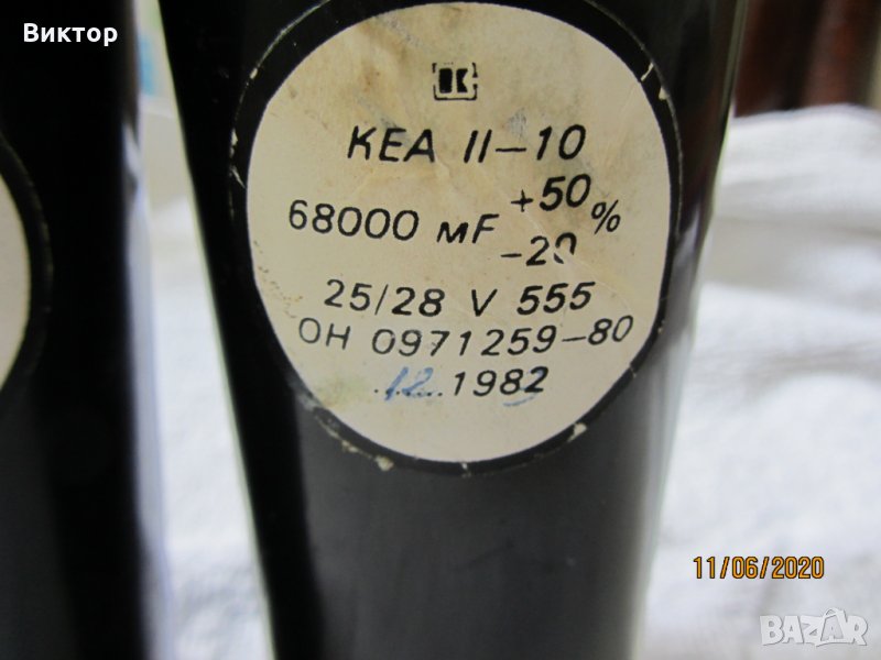 3. Кондензатори тип КЕА II - 10, 68000 микрофарада, 25/28V 555. Произход - България. Снимки - 6, 7 и 8. Размери - диаметър - 55 мм., дължина - 158 мм. Единична цена - 2.0 евро.