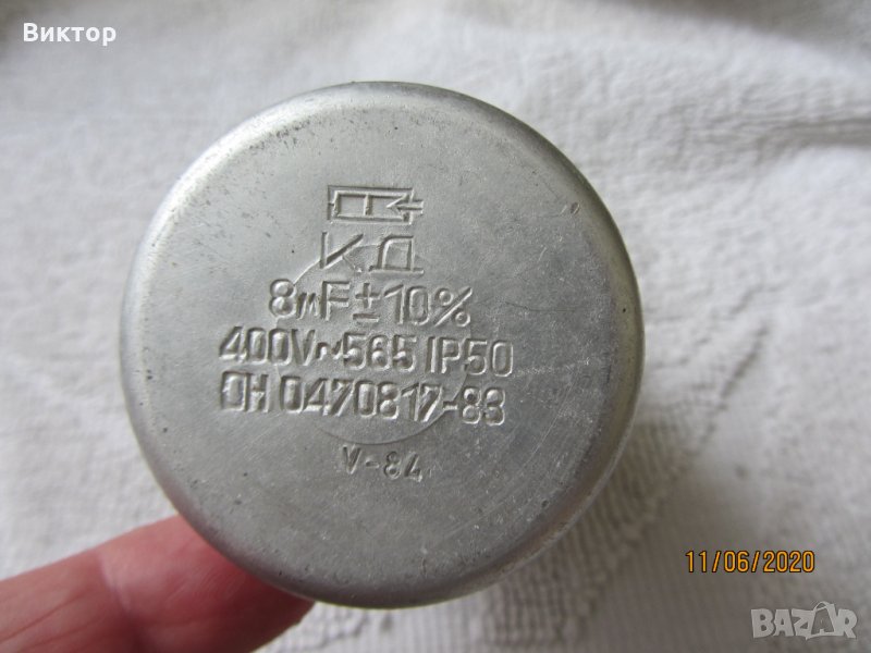 2. Кондензатор 8 микрофарада, 400V, IP50, отговарящ на изискванията на ОН0470817-83. Размери - ф 55 мм, дължина - 84 мм. Произход - България. Моля вижте снимки 3 , 4 и 5. Цена - 2.5 евро.