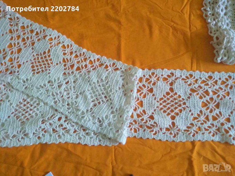 Последен е комплект от малко перденце за нанизване и две карета към него.Много фини и нежни.Карета 27/75см, перде - ширина 65см, дължина 50см.Без забележки.