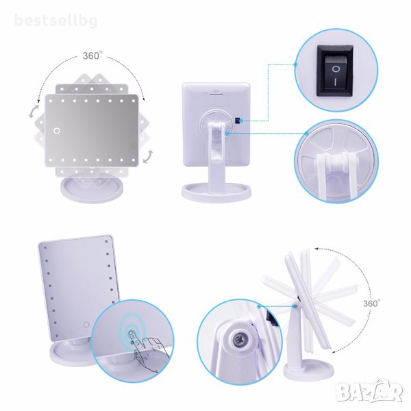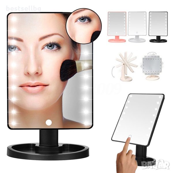 Луксозно леко сгъваемо голямо настолно огледало с LED осветление с възможност за въртене на 360 градуса и тъчскрийн бутон с димер за грим, баня, тоалетка, гримиране, дома, деца, фризьорски, салон, гримьорна, лице, жена, бюро