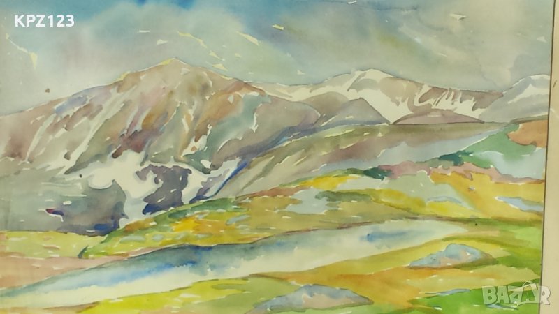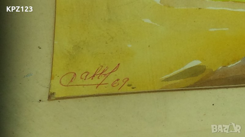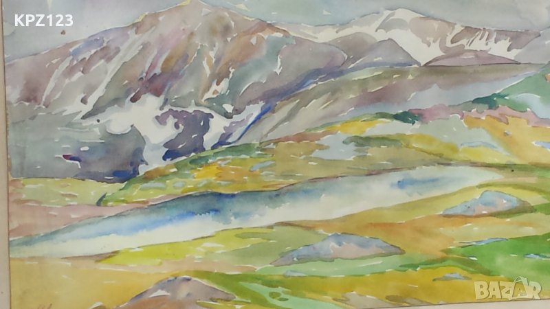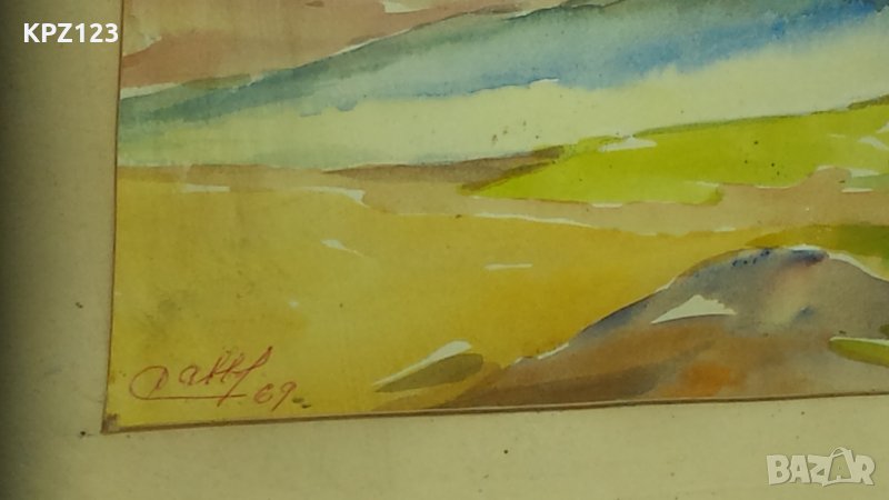 Стара картина изобразяваща планински пейзаж, подпис на латиница (долу ляво) Dabbof , датирана 1969 година. Картината е с паспарту има рамка с предпазно стъкло.
