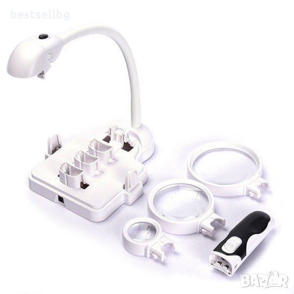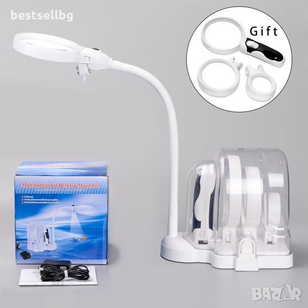 Многофункционална универсална професионална ръчна и настолна увеличителна лупа с три вида сменяеми лещи увеличение 2X 5X 16X LED осветление чупещо се рамо за четене, шиене на гоблени, бродиране, бродерия, козметик, бюро, часовникарса за работа, злато, електроника, рисунки, рисуване, свободни ръце, телефон, монитор, компютър, монети, маникюр, платки, проверка на лична карта и банкноти, запояване, диаманти, документи, деца, декстоп, насекоми, маса, марки и др.