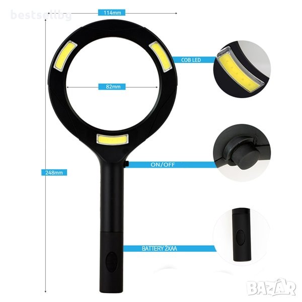 Професионална увеличителна ръчна лупа от стъкло с LED осветление 3W COB MAGNIFIER, голямо увеличение 3X и голям диаметър 80mm за четене, офис, домашна употреба, ремонт на часовници, електроника и други предмети, запояване, шиене на гоблени, бродиране, рисуване, проверка на камъни, злато, монети и др