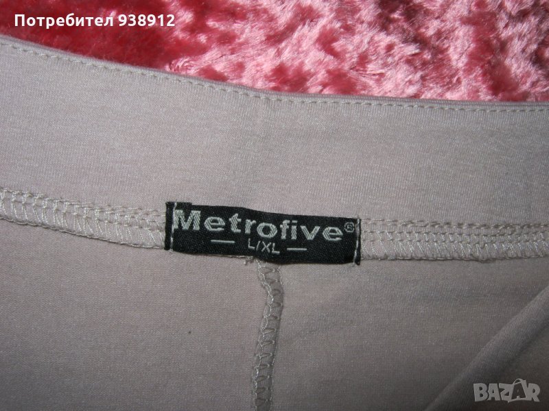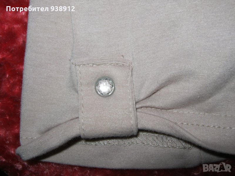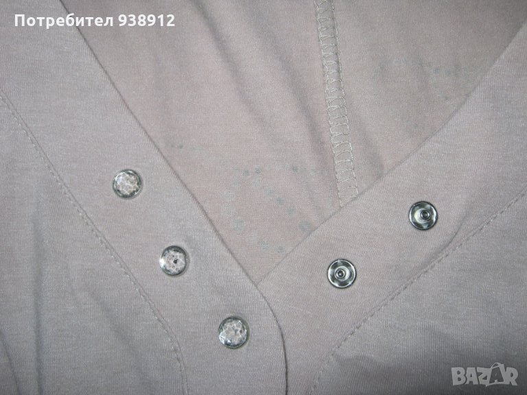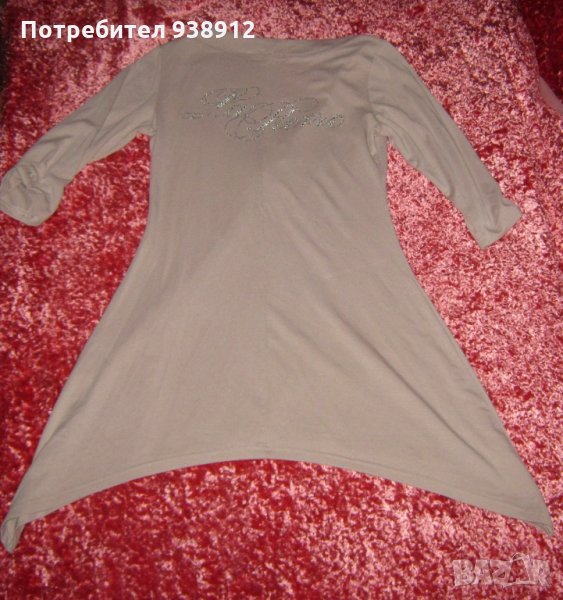 Дамска екстравагантна блуза, цвят пепел от рози с 7/8 ръкави. Туниката е изострена в двата края и има декоративни камъчета на гърба и клипсове на деколтето и ръкавите. Размер L/XL, дължина 79 см. Туниката е без етикет, понеже ми е подарък, но не е моя размер.