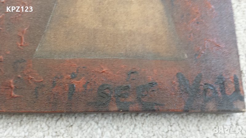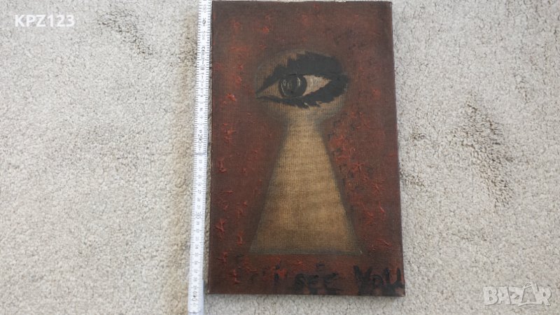 Картина абстракция, надпис в долната част " I see you" .Рисувана с маслени бои върху платно с подрамка. Има повреда в горната лява част на платното може да се поправи.