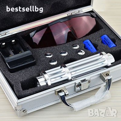 Мощен син виолетов акумулаторен лазер 5000mW с 5 приставки за различни фигури, зарядно устройство на 220V, с две акумулаторни батерии 16340, предпазни очила и луксозна кутия за съхранение пука балон, запалва клечка кибрит или цигара и кутия YX-017S + 2 акумулаторни батерии (резервни).