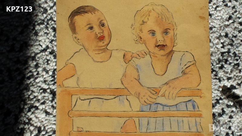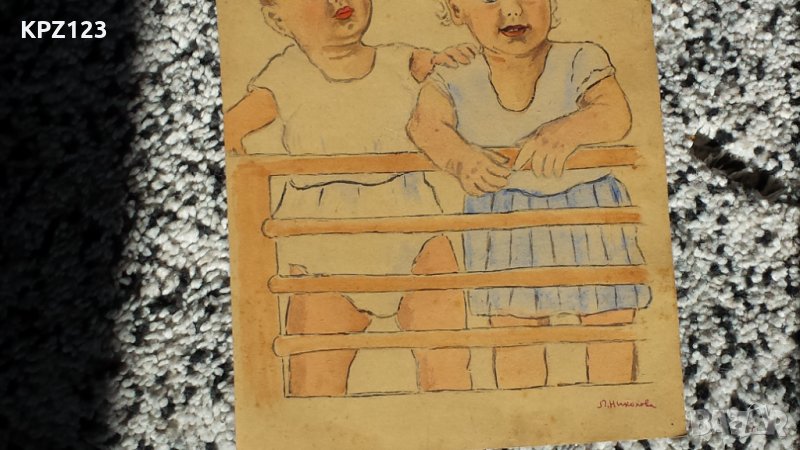 Много стара картина нарисувани две малки деца около1940 година от художничката Лиляна Николова, (долу дясно) подпис.