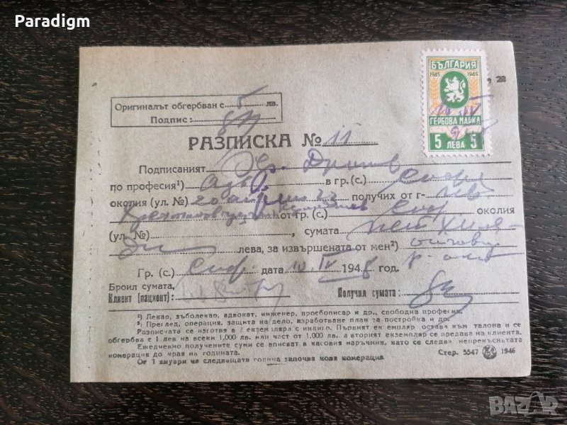 На документа има налична 1 гербова марка за 5 лв. от 1945г.