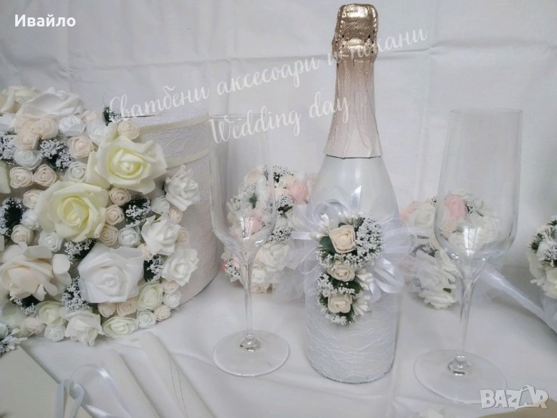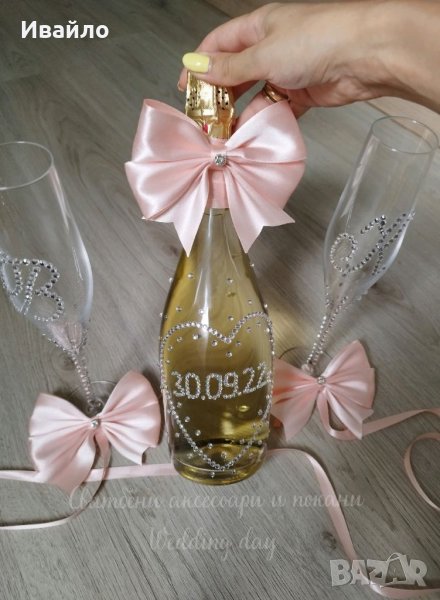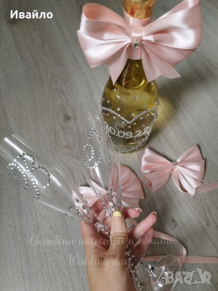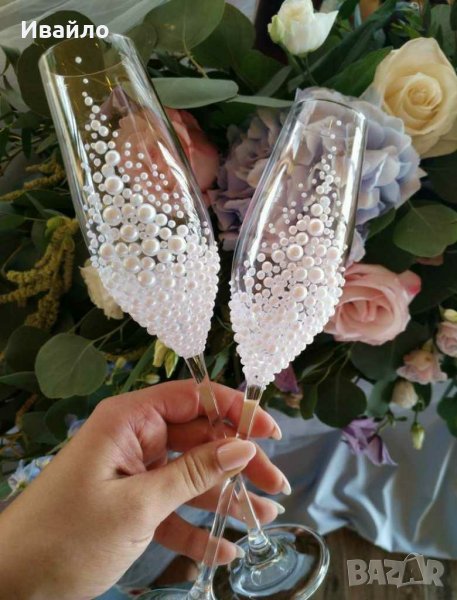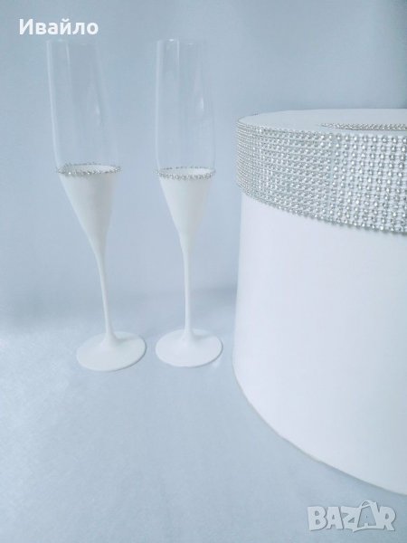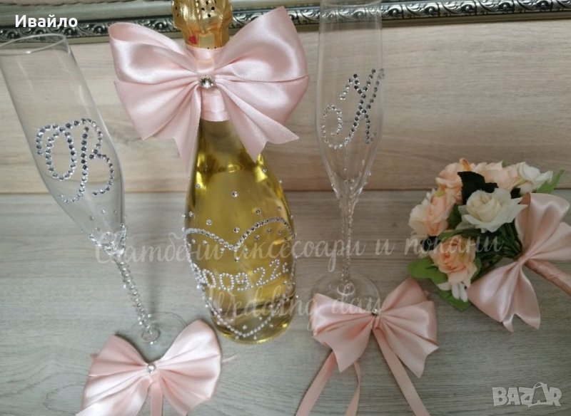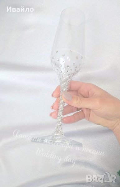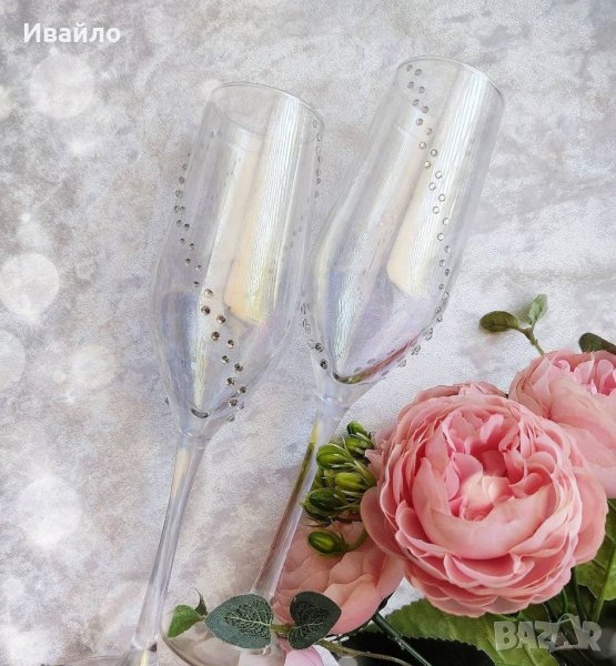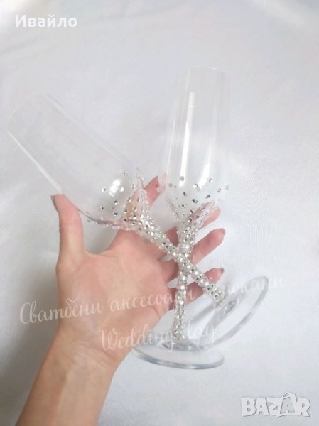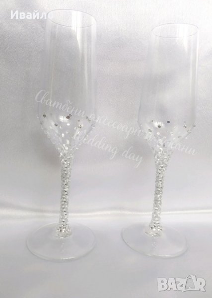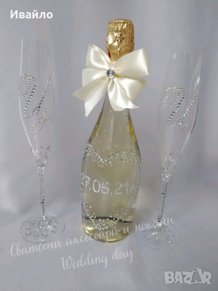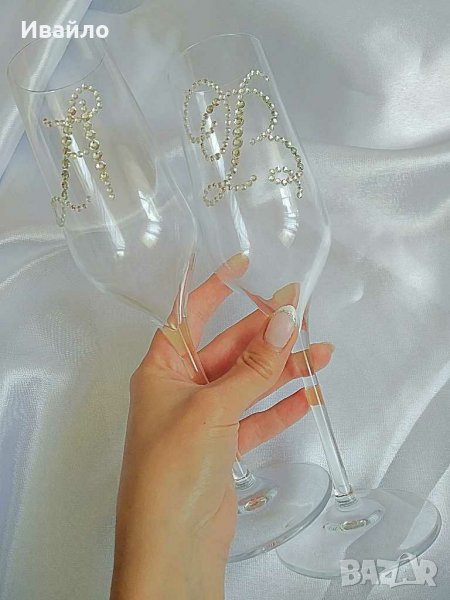 При поръчка Вие избирате дизайна на инициалите, дали да има повече камъни или по-малко.Може да бъде украсено и столчето на чашите и да бъде добавена Вашата сватбена дата. Вие избирате как да бъдат декорирани. Предлагаме шампанско и украса за Вашите чаши.