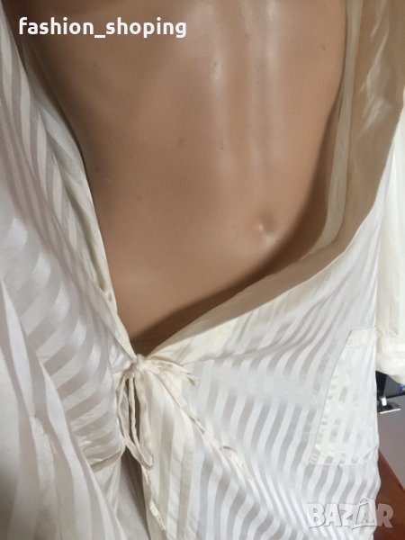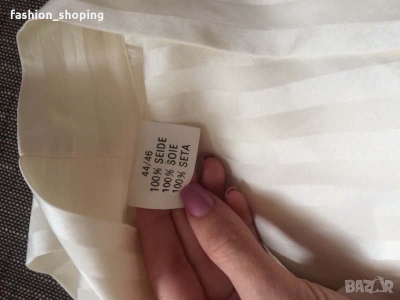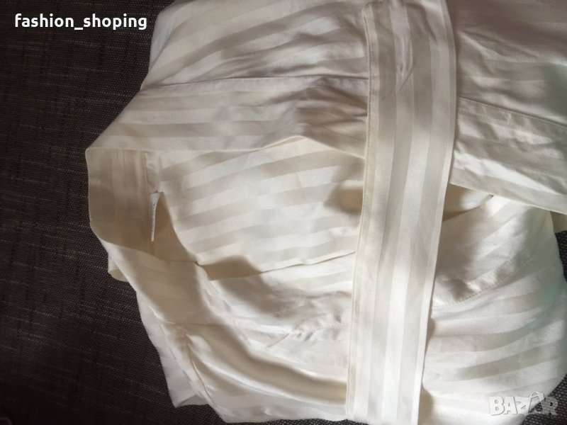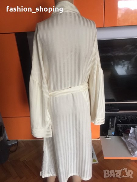 Копринен луксозен халат в цвят шампанско, галещ кожата. Хубава, плътна коприна. С вертикално райе в същия цвят. Не е носен, със странични цепки в долната част. Едната стои още зашита. С големи джобове за удобство. Страхотен.