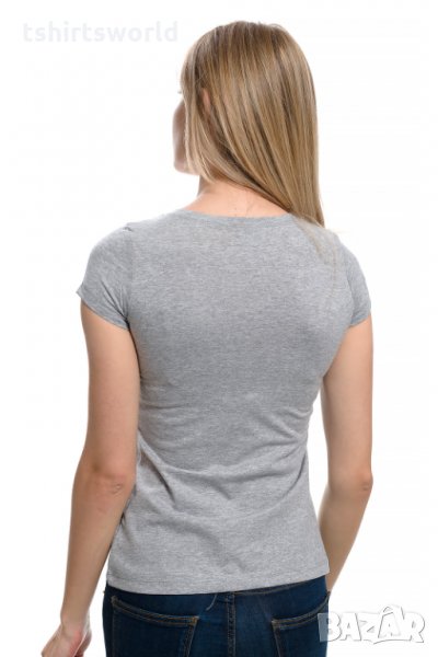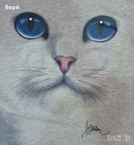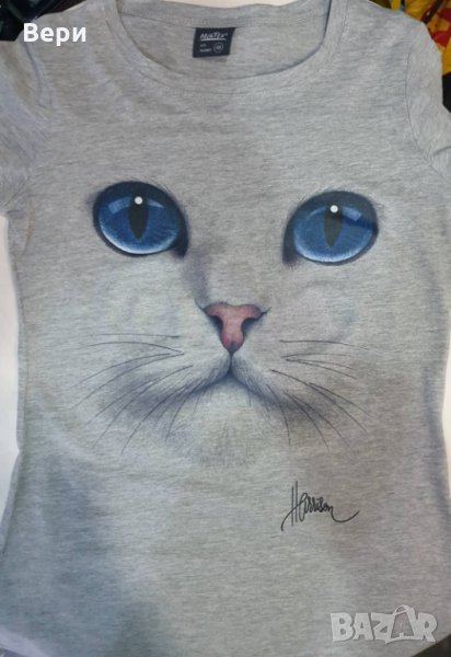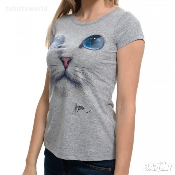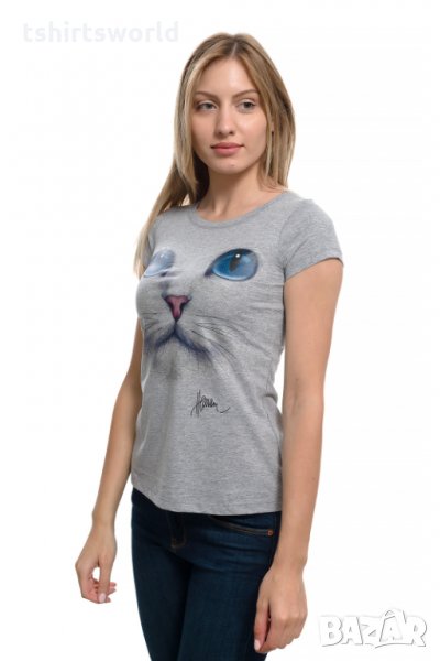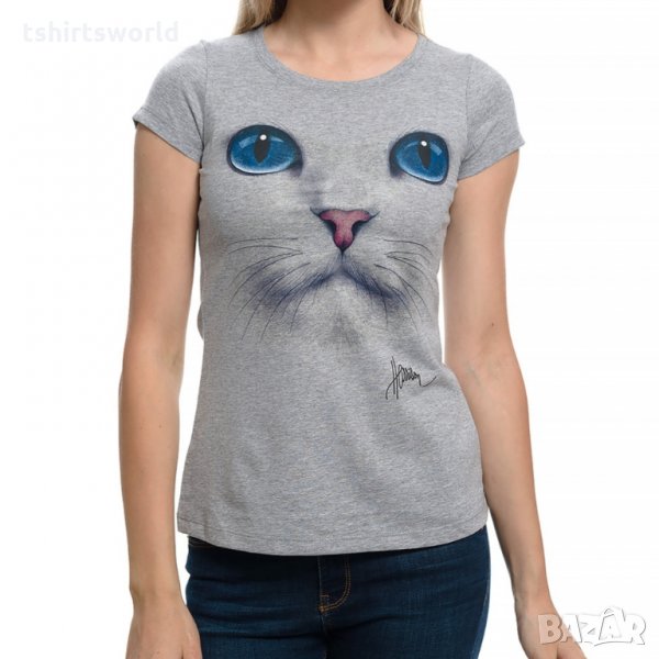 Нова дамска сива тениска с 3D принт Котка със сини очи
