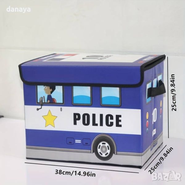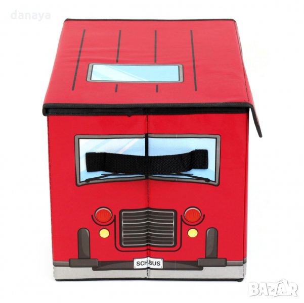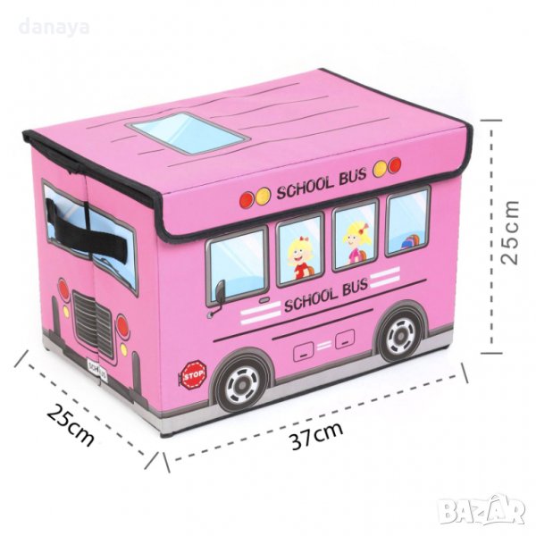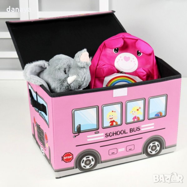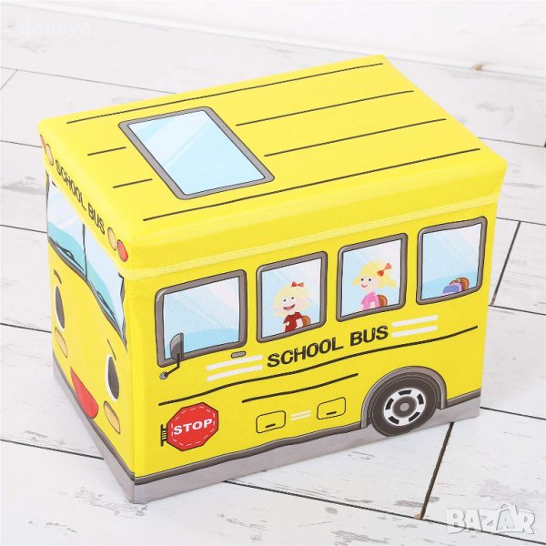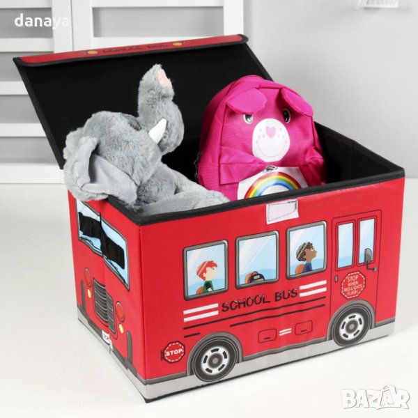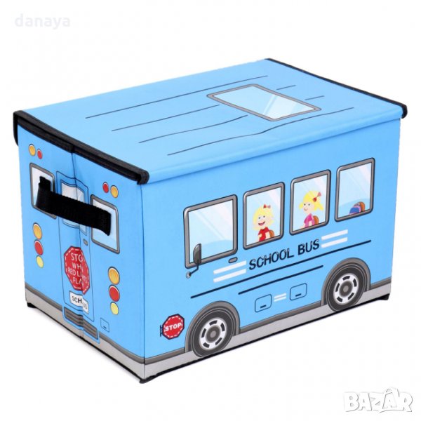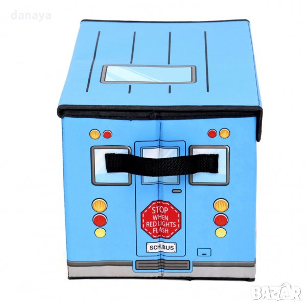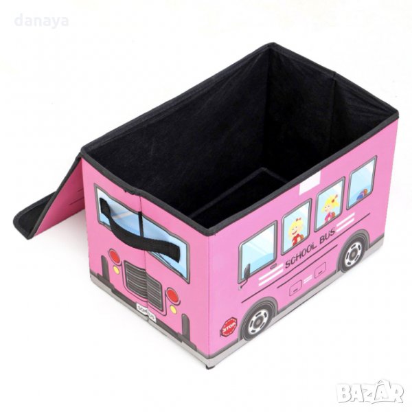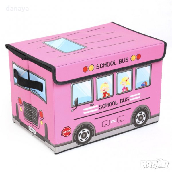 Детска сгъваема кутия за съхранение на играчки или други аксесоари с много свеж и ярък принт на училищен автобус. Кутиите са сгъваеми и това позволява лесното им съхранение, когато не се използват. В тях може да съхранявате играчки, училищни пособия, аксеоари и други вещи на детето. Капакът се затваря с велкро лента. Кутията има и странични дръжки за лесно пренасяне.