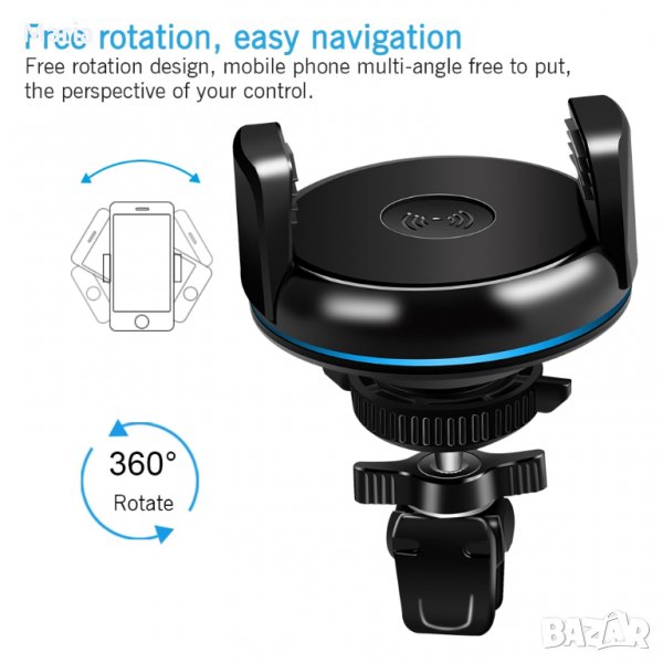 Стойка за кола въртяща на 360 градуса, регулируема, с безжично зареждане, подходяща за iphone, Samsung и всички останали смартфони, поддържащи функцията Qi Wireless Charging