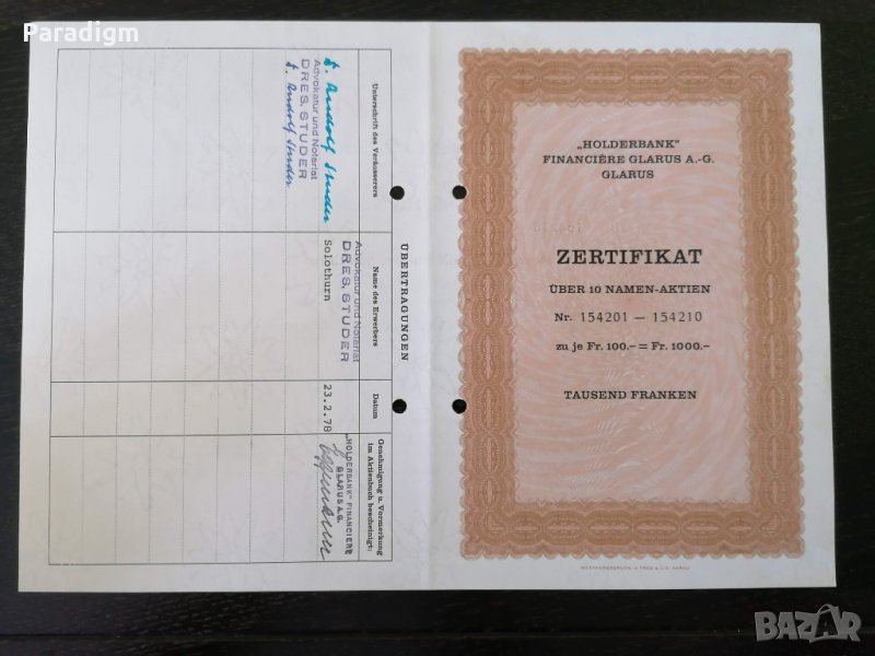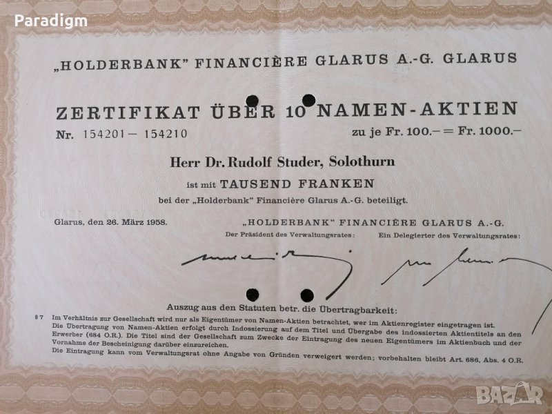 Сертификат върху 10 акции от 1958г.