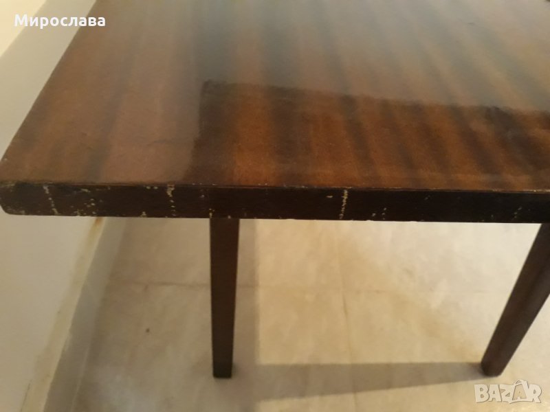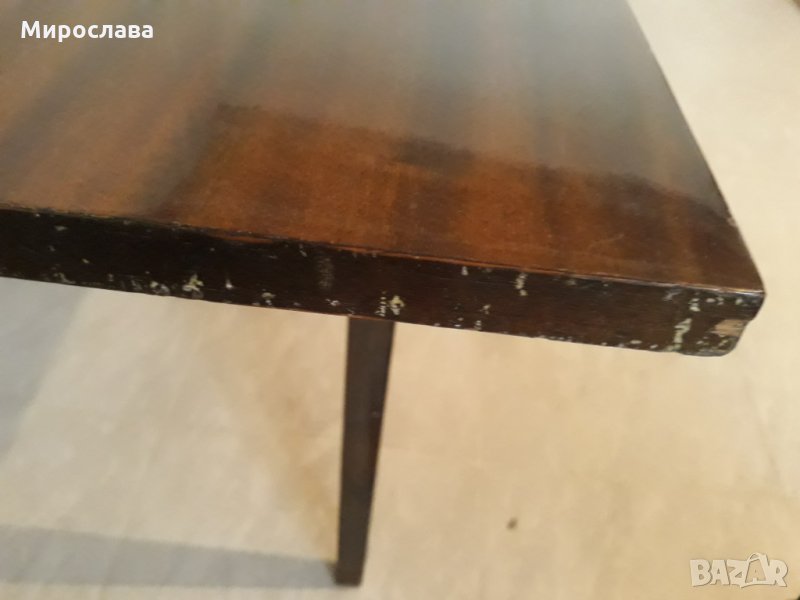Запазена, плота е лакиран. Малки забележки по страничните ръбове показани на снимките. Размери на плота 55/120 см., височина 55 см.