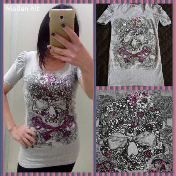 4. Цена 2,50 евро. Тениска/туника с череп. Светло сива с щампа. 95% памук, 5% ликра. Няма размер по етикет. Има голяма еластичност. Дължина 70 см., мишници: 41 см. Отлична.