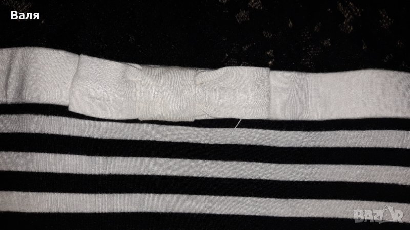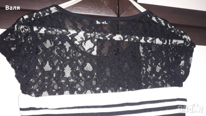 Продавам дамска блуза, черно бяла, черна дантела в горната част и трико в долната, като бялата ивица по средата е еластична.