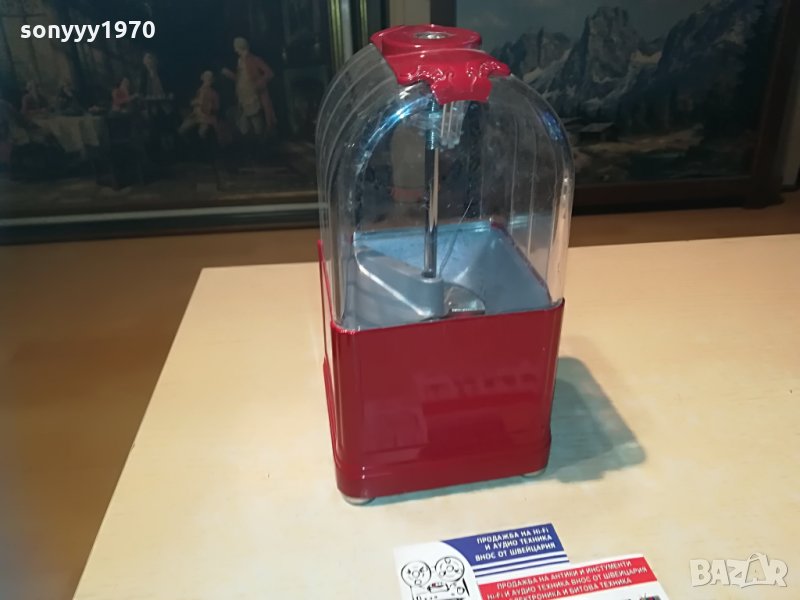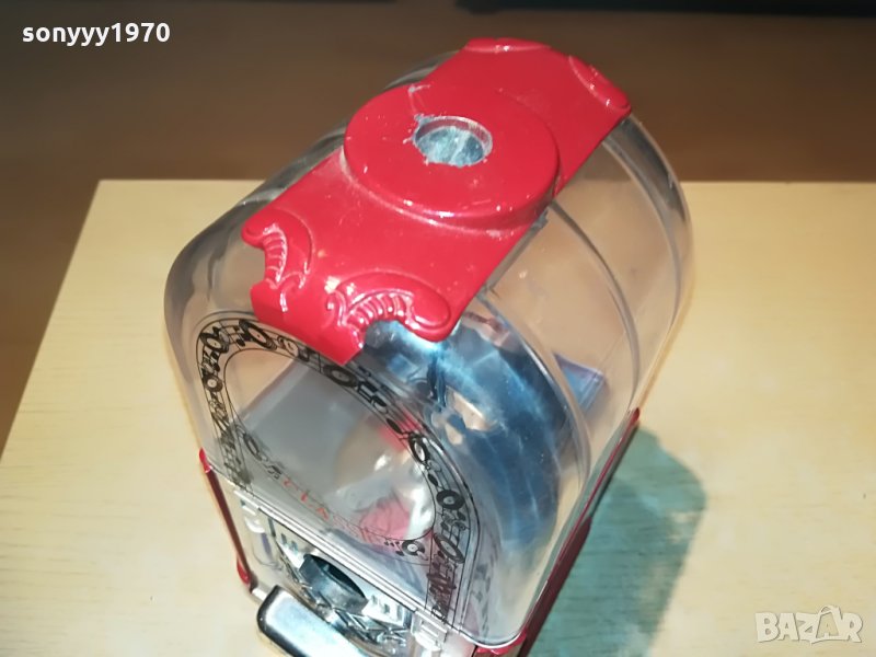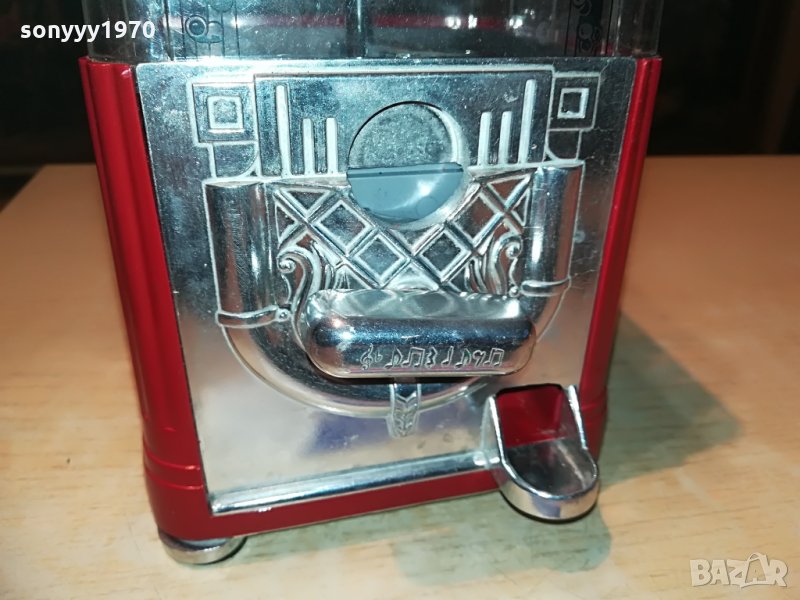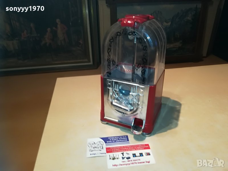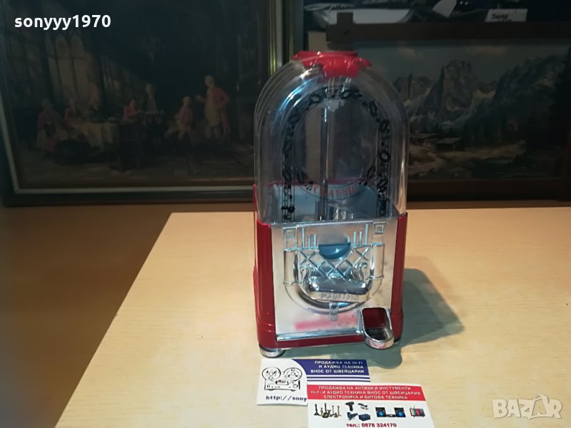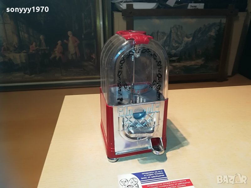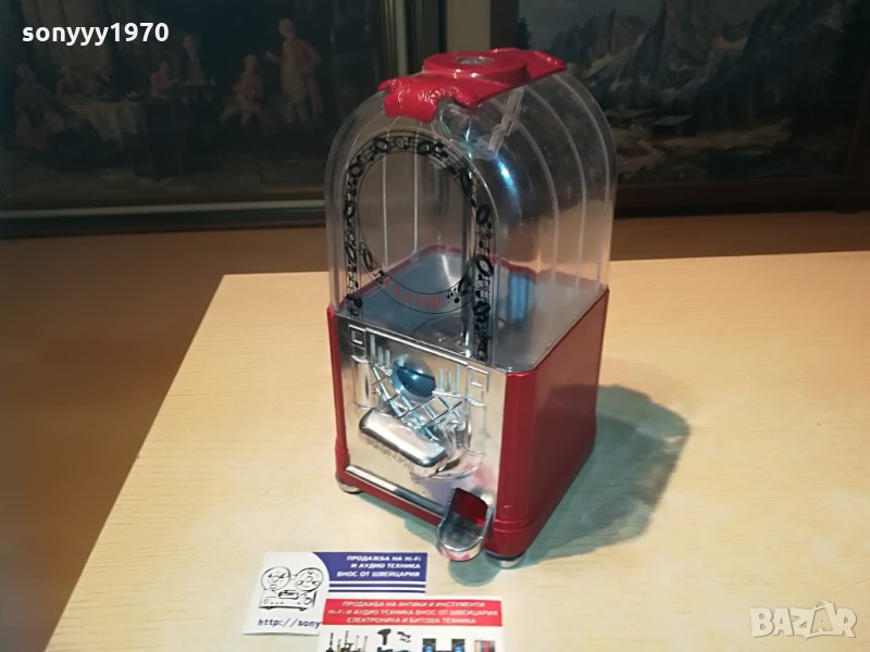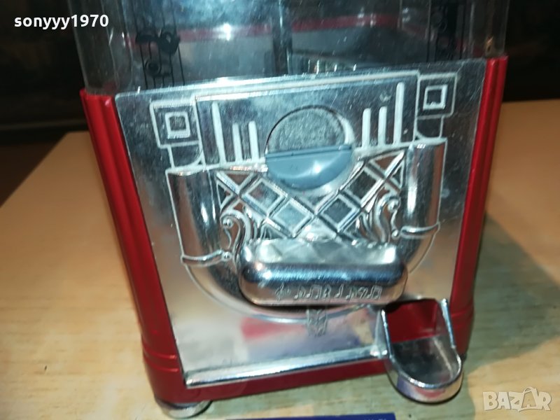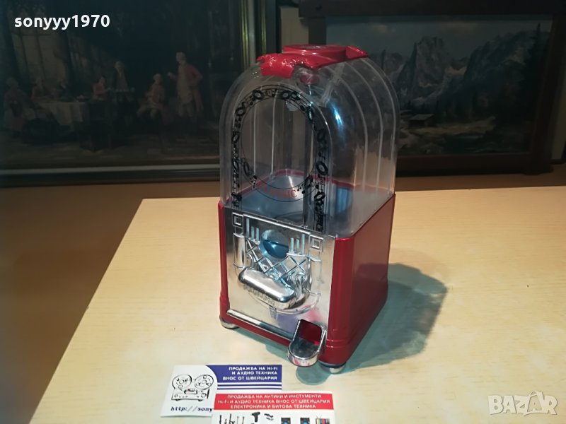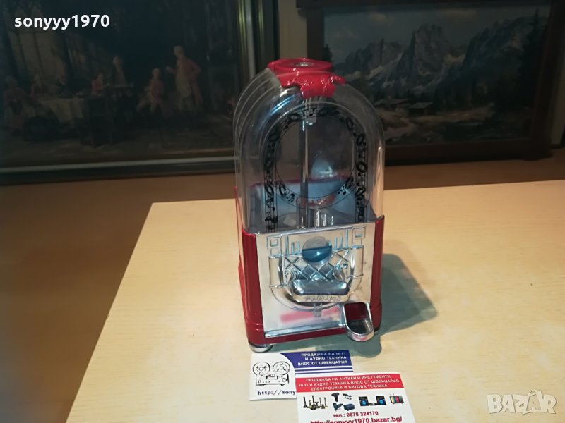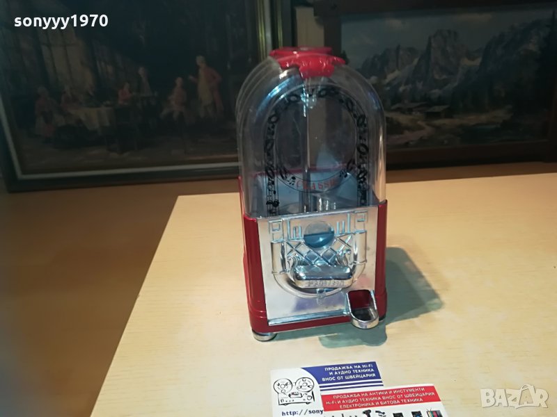 25х13х13см-красива и стилна за колекция или ползване-предполагам е за бонбони-пускаш монета и завърташ и ти пуска бонбон-от днес 28.02.22г пращаме със спиди или еконт с преглед и тест след превод на капаро за куриерската услуга поради зачестили некоректни потребители-поръчки само тук в саита! по телефона и със смс не! краини цени! бартери не правиме! всеки ден нови неща-още 2-3 наши обяви тук