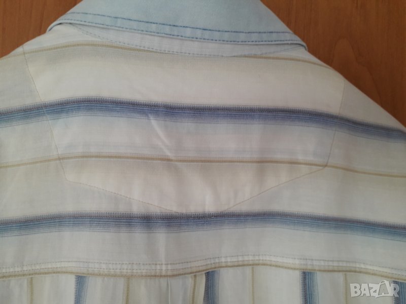 Мъжка риза къс ръкав тип спортно елегантна, с 2 джоба с копчета, материя на райета 100 % памук в комбинация със светлодънков гладък плат, размер Л-ХЛ рамене 52 см, гърди отпред - 62 см, дължина 73 см, ръкав 28 см. Ризата е много запазена и добре стои. Отговарям на съобщения тук, изпращам с куриер с отстъпка, преглед и тест, или лично предаване в София.