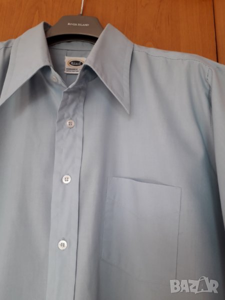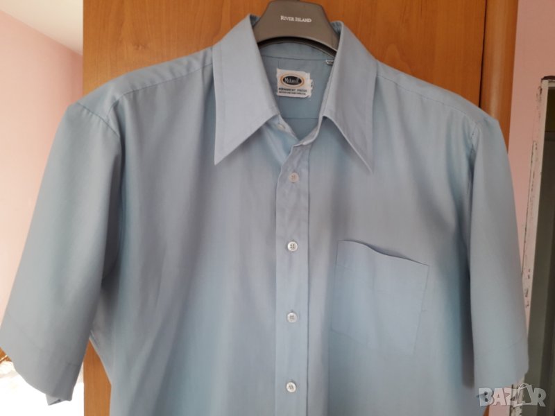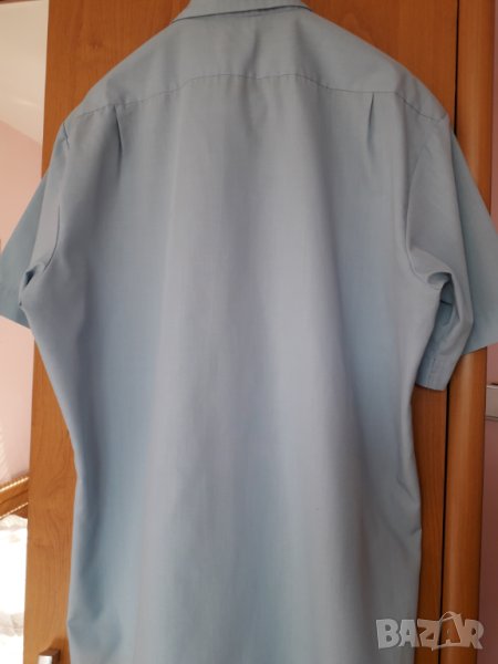 Мъжка риза къс ръкав синя, с 1 джоб, 35 % памук и 65 % полиестер, размер 16 и 1/2, Л-ХЛ, рамене 48, гърди 62 см, дължина 70 см, ръкав 26 см. Ризата е нова, само е пробвана. Отговарям на съобщения тук, изпращам с куриер с отстъпка, преглед и тест, или лично пердаване в София.