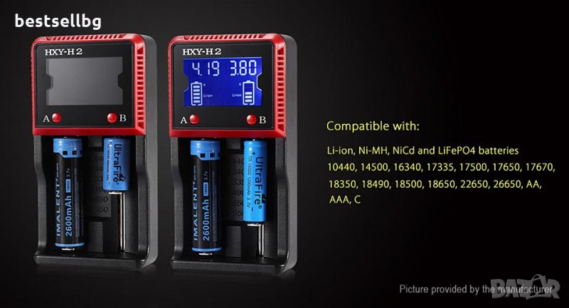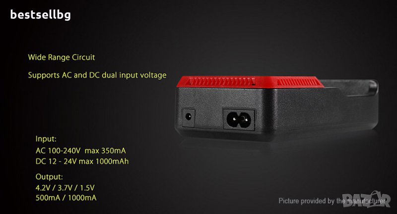 Устройство дава възможност за зареждане 1 или 2 батерии едновременно, всяка от която се зарежда независимо с отделен слот на LCD дисплея.