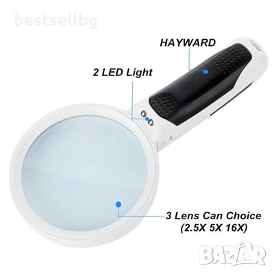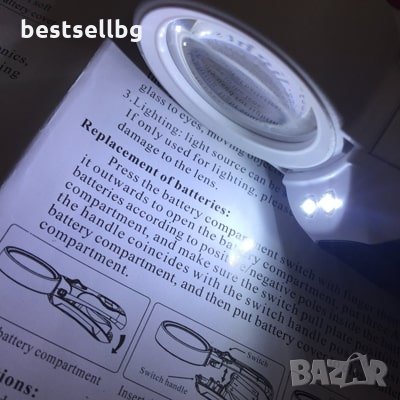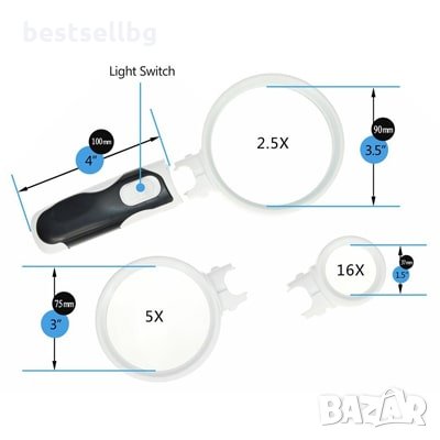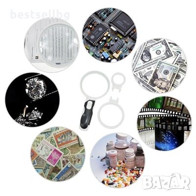 Универсална ръчна лупа с LED осветление, сменяеми лещи с разични увеличения 2.5x, 5x, 16x голямо увеличение за ремонт на часовници, компютри, лаптопи, фотоапарати и други предмети, запояване, четене, шиене на гоблени, бродиране, рисуване, злато, маникюр, бижута, монети, всякакъв вид работа и други дейности, в които се изисква увеличение и осветление.