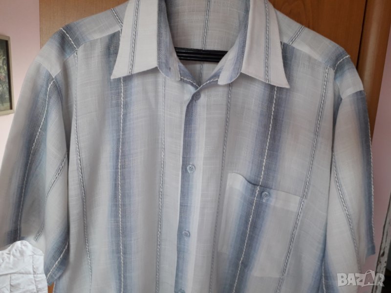 Мъжка лятна риза къс ръкав, с 1 джоб, на райета в синьо и бяло, много приятна памучна тънка материя, абсолютно запазена, обличана 1-2 пъти. Размер Л-ХЛ рамене 52 см, гърди 62 см, дължина 72 см, ръкав 26 см. Отговарям на съобщения тук.