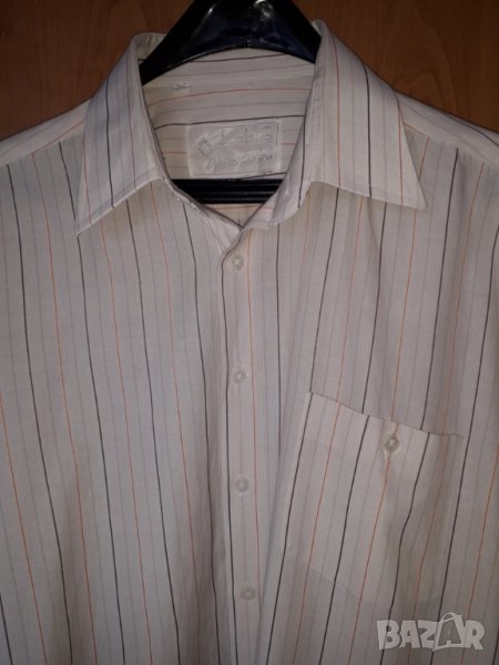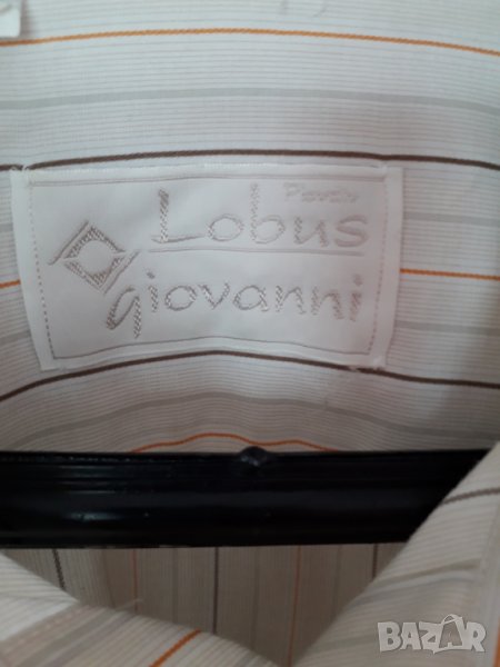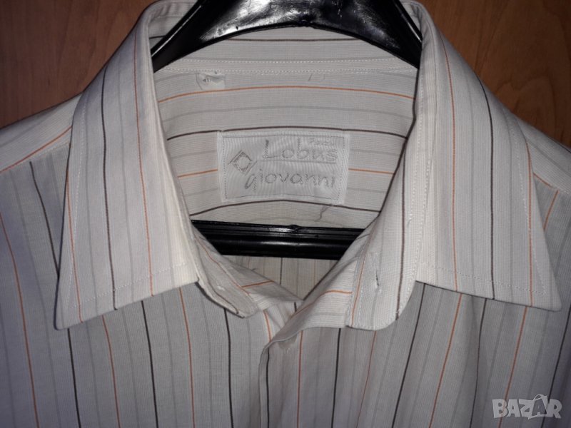 Мъжка риза дълъг ръкав Lobus Giovanni, с 1 джоб, цвят бял с кремаво и кафяво оранжеви райета, номер 41/42, размер Л-ХЛ, рамене - 50 см, гърди - 60 см, дължина - 68 см, ръкав - 61 см. Ризата е абсолютно запазена, обличана 1-2 пъти. Отговарям на съобщения тук или тел. 0887780808, изпращам с куриер или лично предаване в София