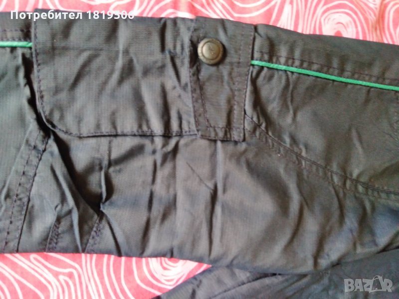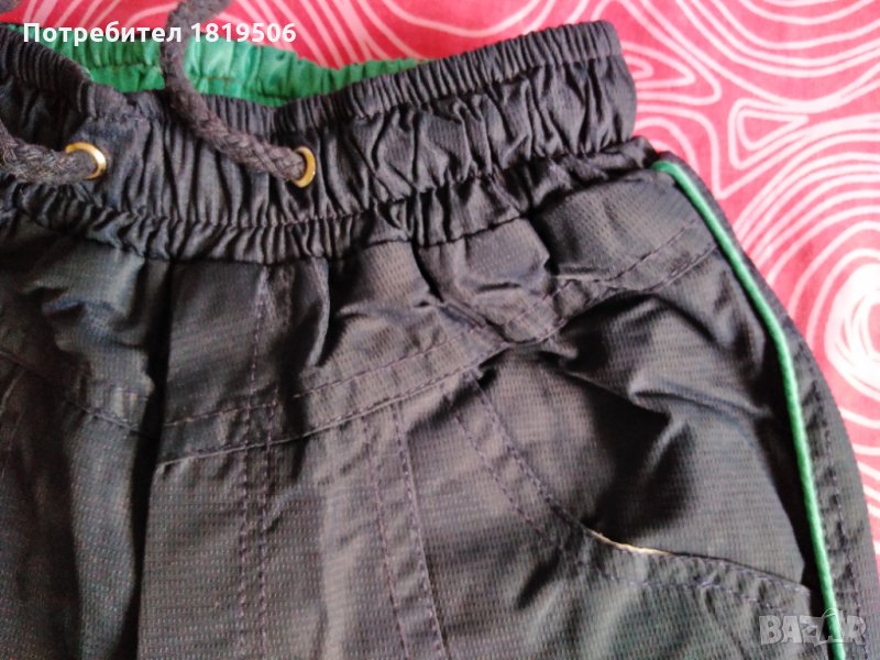 детски зимен панталон от непромукаем мек плат (като гумиран и промазан и в същотот време е много мек плат), който не пропуска вода, с плътна и мека поларена подплата, с ластика в кръста и връзки, в долната част на крачола има ластики с ограничители за пристягане към крачето , има по два джоба отпред и отзад и един на десен крачол,
