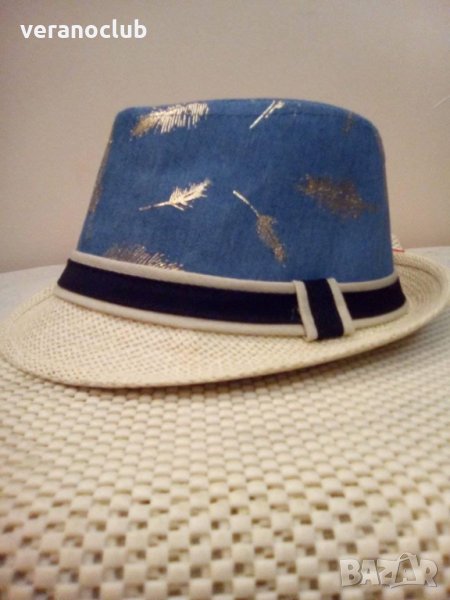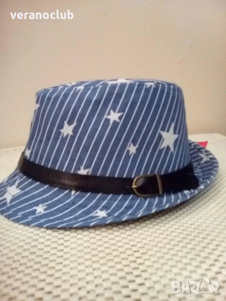 Детско дънково бомбе - шапка от памучен дънков плат в характерен цвят деним, декорирано с кожено коланче. Шапката е апликирана с ъс звездички и раирана със светли линии.